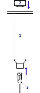Внешне такого рода шприц схож с медицинским аналогом. Разница состоит в значительно более толстых стенках, а также наличии винтового замка, к которому крепится дозирующая насадка. Если посмотреть на схему, то станет понятен принцип работы шприца (1), в которому крепится насадка в виде иглы (3), а сверху применяется небольшой поршень (2). Важная особенность: при использовании некоторых технических жидкостей (к примеру, цианоакрилатный клей) короткий поршень не применяется.