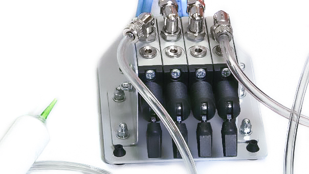 Пневматический коммутатор обеспечивает подключение до четырех шприцов к одному дозатору. При включении одного из тумблеров пневмоимпульсы поступают в шприц с выбранной жидкостью.