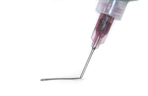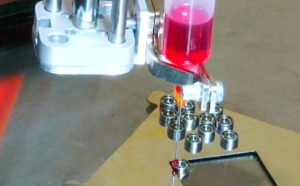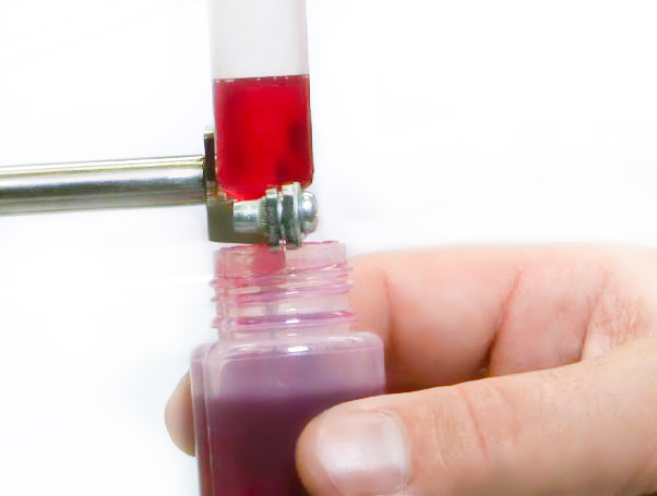 Шприц автоматически поднимается в исходное положение, в то время, как жидкость растекается в изделии.