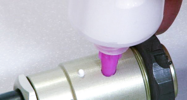 Теперь подключаем шприц к быстросъемному адаптеру, подсоединяем насадку и удаляем собравшийся у носика воздух в режиме ПРОКАЧКА.