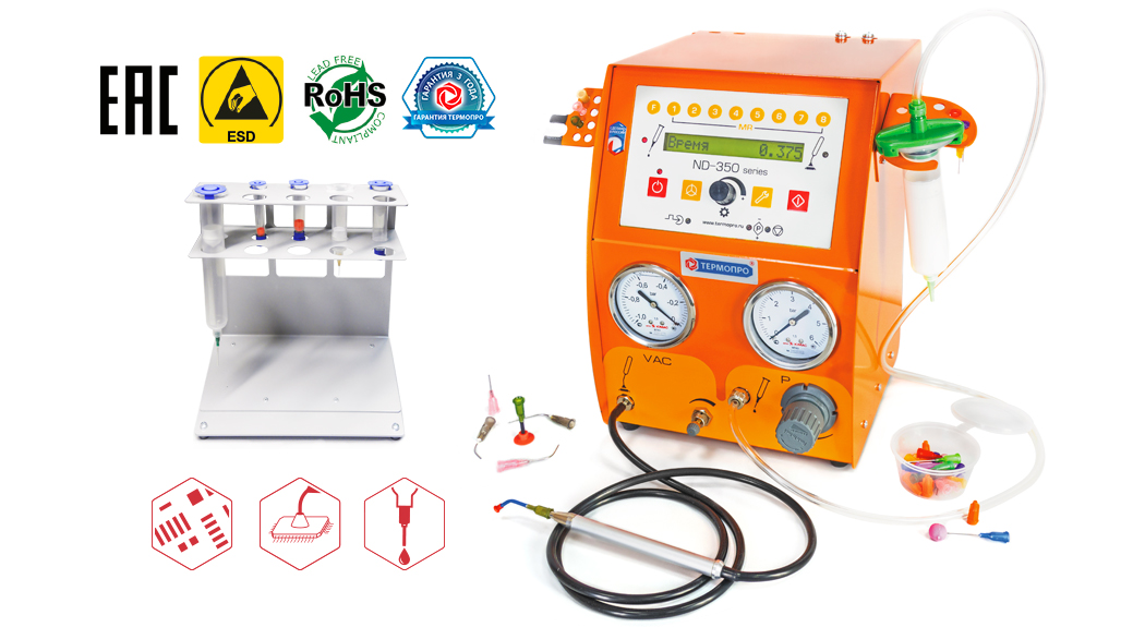 Перечисленные особенности особенно полезны при микродозировании мелкозернистых паяльных паст, а большие и точные манометры облегчают контроль рабочего давления и вакуума. Отличия ND-350 от ND-35 посмотрите здесь.
